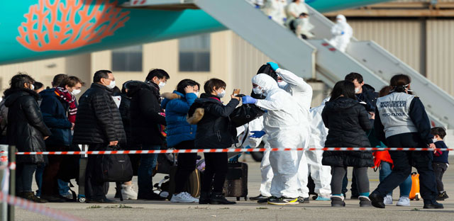 ▲ Autoridades sanitarias revisan a los pasajeros que arribaron al aeropuerto militar de Istres, Francia, en un avión fletado por el gobierno de ese país para desalojar de Wuhan, China, a 250 personas de diversas nacionalidades, entre ellas 65 franceses y 10 mexicanos. Alrededor de 20 de los trasladados están a la espera de análisis, ya que presentaron síntomas de coronavirus. La Secretaría de Salud nacional señaló que los 10 compatriotas serán sujetos a nuevas pruebas cuando retornen a nuestro territorio. Foto Afp
