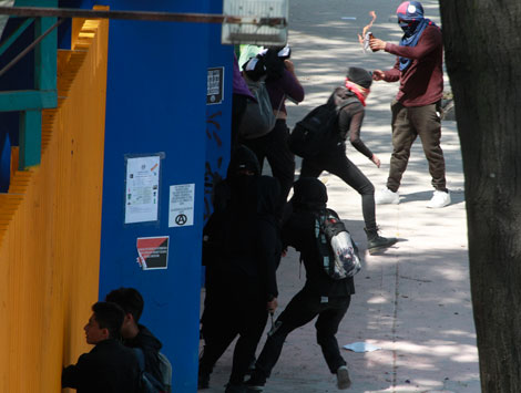 Alrededor de 20 personas ingresaron al plantel, el cual había sido liberado horas antes tras un paro de labores que comenzó el lunes en protesta por la agresión de encapuchados a una alumna la semana pasada. El grupo arrojó piedras, explosivos y otros objetos a docentes y trabajadores. Las autoridades de la UNAM condenaron los hechos, que sólo buscan desestabilizar la vida universitaria, e informaron que el ataque causó 14 lesionados, ninguno de gravedad. Foto Alfredo Domínguez. / Arturo Sanchez Jiménez