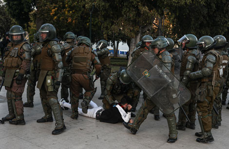 Una multitud se concentró ayer de forma pacífica en la Plaza de la Dignidad de Santiago, en una jornada de protestas en Chile contra el gobierno de Sebastián Piñera. Sin embargo, en calles aledañas se produjeron enfrentamientos entre manifestantes y carabineros, quienes arremetieron con carros lanza agua y lanza gases. Uno de los hechos más graves fue el incendio del museo dedicado a Violeta Parra, figura de la cultura popular chilena. La imagen, en Viña del Mar. Foto Ap. / Prensa Latina