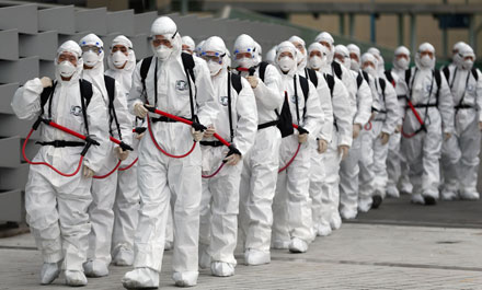 ▲ Estados Unidos informó ayer que hay más de 60 infectados en su territorio, entre estos un tercer caso de una persona que no viajó ni estuvo en contacto directo con otras que tengan síntomas de la enfermedad, mientras Corea del Sur, el segundo país más afectado, registró ayer 376 nuevos contagios, con lo que ya son 3 mil 526, incluidos 17 muertos. Italia reportó ocho muertos más, con lo que suman 29. En América Latina, Ecuador se sumó a la lista de afectados por el nuevo coronavirus, con un caso. En la imagen, soldados surcoreanos rocían desinfectante en la ciudad de Daegu, como parte de las medidas para prevenir la epidemia. Foto Afp