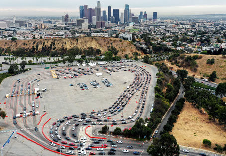 ▲ En vista aérea desde un dron, decenas de conductores hacen fila para ingresar a un sitio de prueba de Covid-19 en el Dodger Stadium, en Los Ángeles, en el nuevo confinamiento por regiones en California. La medida afecta a 33 millones de habitantes, en un intento por contener la propagación y la saturación del sistema hospitalario. Museos, cines, zoológicos, salones de belleza, entre otros espacios, se encuentran cerrados, mientras los restaurantes están abiertos sólo para llevar comida. Foto Afp
