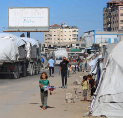 ▲ Camiones con enseres pasan junto al campo de refugiados de Nuseirat. Foto Afp